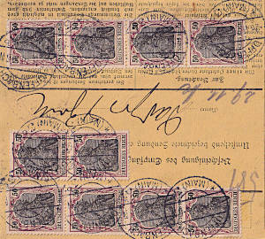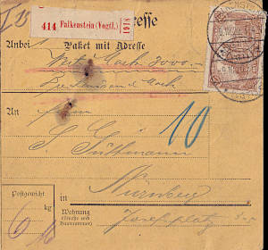 Inlandspaketkarte mit Wertangabe (1 500 Mark) (2 910 g, > 75 km) vom 25.11.1920 frankiert mit 13 Marken a 50 Pfennig (=6,50 Mark, 2 Paket 0,50 Einschreiben 4 Wert) |