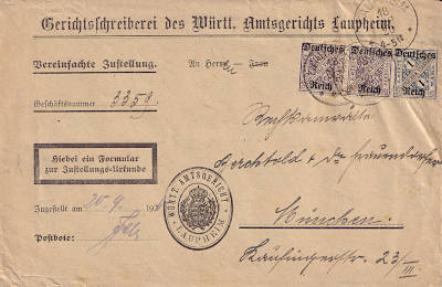 Inlandsbrief mit Zustellungsurkunde (1-20 g) vom 18.09.1920 frankiert mit 3 Marken(=1,30 Mark, 0,40 Brief 0,50 Zustellung 0,40 Urkunde)