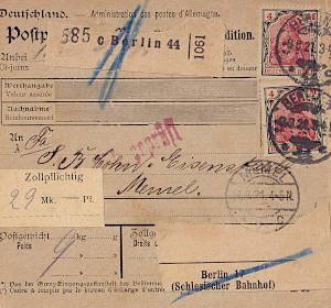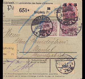 Auslandspaketkarte (4 500 g, > 75 km) vom 06.10.1921 frankiert mit 3 Marken (=4 Mark) |