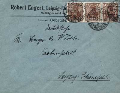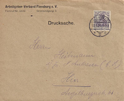 Inlandsdrucksache (1-50 g) vom 13.04.1921 frankiert mit einer Marke a 15 Pfennig (=15 Pfennig) |