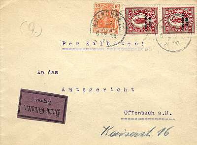 Inlandsbrief mit Eilzustellung (1-20 g) vom 23.04.1921 frankiert mit 3 Marken (=2,10 Mark, 0,60 Brief 1,50 Eilzustellung)