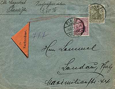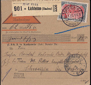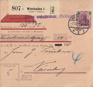 Inlandspaketkarte mit Nach- nahme (5 000 g, > 75 km) vom 07.10.1921 frankiert mit einer Marke a 5 Mark auf 75 Pfennig (=5 Mark, 4 Paket 1 Nachnahme) |