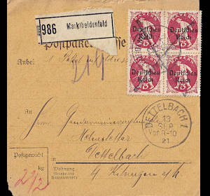 Inlandspaketkarte (2 500 g, < 75 km) vom 13.09.1921 frankiert mit 4 Marken a 75 Pfennig (=3 Mark) |