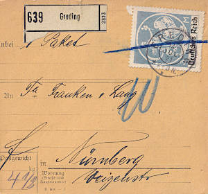 Inlandspaketkarte (4 000 g, > 75 km) vom 14.05.1921 frankiert mit 2 Marken a 2 Mark (=4 Mark) |