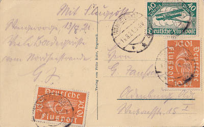 Inlandspostkarte mit Luftpost vom 14.08.1921 frankiert mit 3 Marken (=60 Pfennig, 40 Postkarte 20 Luftpost)