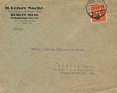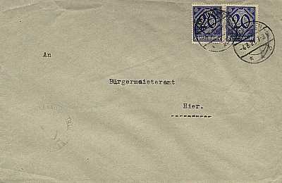 Ortsbrief (1-20 g) vom 04.08.1921 frankiert mit 2 Marken a 20 Pfennig (=40 Pfennig) |