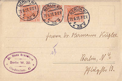Ortspostkarte vom 21.06.1921 frankiert mit 3 Marken a 10 Pfennig (=30 Pfennig)