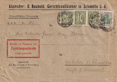 Ortsbrief mit Zustellungsurkunde (1-20 g) vom 25.06.1921 frankiert mit 4 Marken (=1,30 Mark, 0,40 Brief 0,50 Zustellung 0,40 Urkunde) |