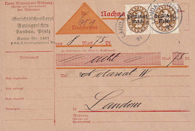 Ortspostkarte mit Nachnahme vom 09.07.1921 frankiert mit 2 Marken a 40 Pfennig (=80 Pfennig, 30 Postkarte 50 Nachnahme) |