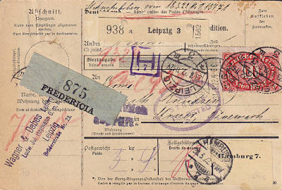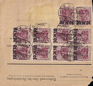Auslandspaketkarte (3 700 g) vom 16.03.1922 frankiert mit 13 Marken a 10 Mark auf 75 Pfennig (=130 Mark)