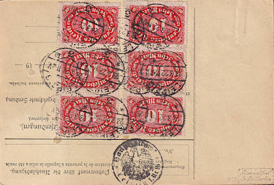 Auslandspaketkarte (3 900 g) vom 23.03.1922 frankiert mit 7 Marken a 10 Mark (=70 Mark)