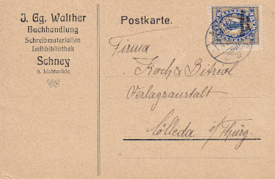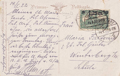 Inlandspostkarte vom 14.01.1922 frankiert mit einer Marke a 1,25 Mark auf 1 Mark (=1,25 Mark) |