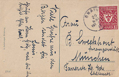 Inlandspostkarte vom 29.05.1922 frankiert mit einer Marke a 1¼ Mark (=1,25 Mark) |