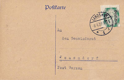 Inlandspostkarte vom 08.04.1922 frankiert mit einer Marke a 1¼ Mark (=1,25 Mark) |