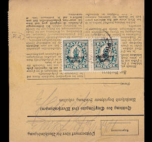 Inlandspaketkarte (2 000 g, < 75 km) vom 08.06.1922 frankiert mit 2 Marken a 3 Mark auf 1¼ Mark (=6 Mark) |