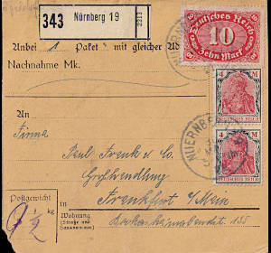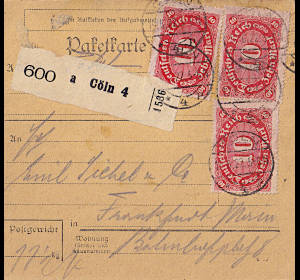 Inlandspaketkarte (11 500 g, > 75 km) vom 19.06.1922 frankiert mit 3 Marken a 10 Mark (=30 Mark) |