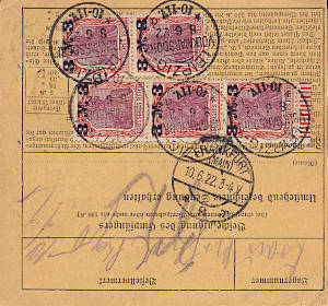Inlandspaketkarte (10 000 g, > 75 km) vom 08.06.1922 frankiert mit 6 Marken a 3 Mark auf 1¼ Mark (=18 Mark) |