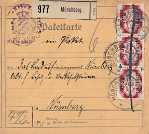 Inlandspaketkarte (3 500 g, > 75 km) vom 07.03.1922 frankiert mit 6 Marken a 1½ Mark (=9 Mark) |
