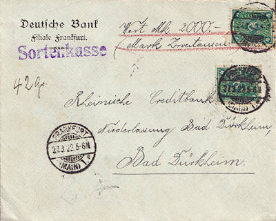 Inlandsbrief mit Wertangabe (2 000 Mark) (42 g) vom 27.03.1922 frankiert mit 2 Marken a 4 Mark (=8 Mark, 3 Brief 2 Einschreiben 3 Wert) |