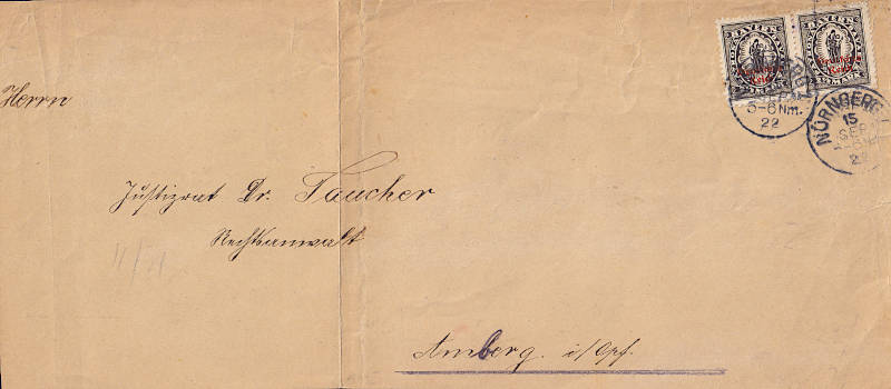 Inlandsbrief (1-20 g) vom 13.07.1922 frankiert mit 2 Marken a 150 Pfennig (=3 Mark) |