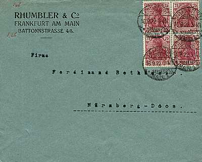 Inlandsbrief (1-20 g) vom 16.09.1922 frankiert mit 4 Marken a 75 Pfennig (=3 Mark) |
