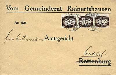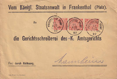 Inlandsbrief (1-20 g) vom 14.08.1922 frankiert mit 3 Marken a 100 Pfennig (=3 Mark) |