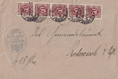 Inlandsbrief (1-20 g) vom 31.08.1922 frankiert mit 5 Marken a 60 Pfennig (=3 Mark) |