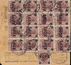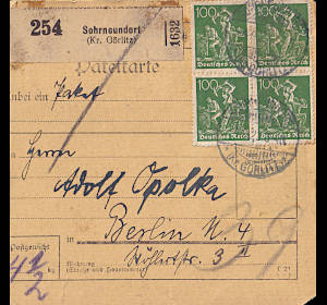 Inlandspaketkarte (4 500 g, > 75 km) vom 04.09.1922 frankiert mit 14 Marken a 1 Mark (=14 Mark) |