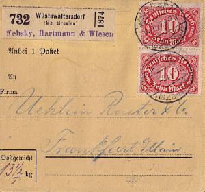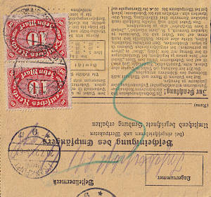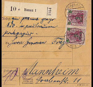 Inlandspaketkarte (7 500 g, > 75 km) vom 06.09.1922 frankiert mit 2 Marken a 10 Mark (=20 Mark) |