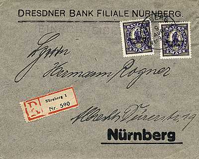 Ortsbrief mit Einschreiben (21-100 g) vom 09.08.1922 frankiert mit 2 Marken a 2 Mark (=4 Mark, 2 Brief 2 Einschreiben)