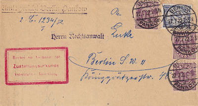 Ortsbrief mit Zustellungsurkunde (1-20 g) vom 27.07.1922 frankiert mit 4 Marken (=3,50 Mark, 1 Brief 1,50 Zustellung 1 Urkunde)