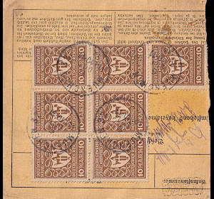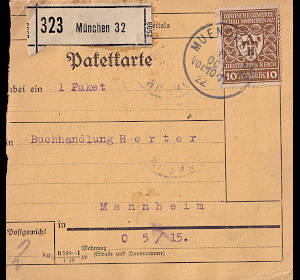 Inlandspaketkarte (2 000 g, > 75 km) vom 06.10.1922 frankiert mit8 Marken a 10 Mark (=80 Mark)