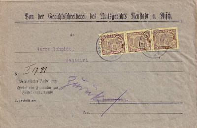 Inlandsbrief mit Zustellungsurkunde (1-20 g) vom 09.11.1922 frankiert mit 3 Marken a 5 Mark (=15 Mark, 6 Brief 3 Zustellung 6 Urkunde) |