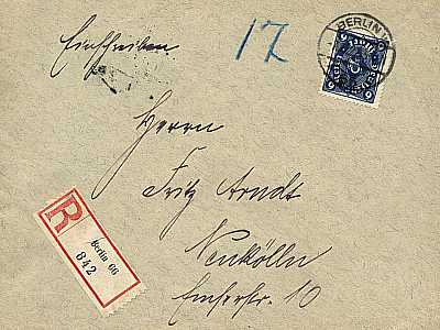 Ortsbrief mit Einschreiben (1-20 g) vom 07.11.1922 frankiert mit einer Marke a 6 Mark (=6 Mark, 2 Brief 4 Einschreiben)
