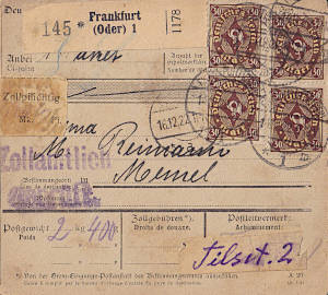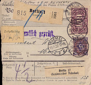 Auslandspaketkarte (18 500 g, > 75 km) vom 24.11.1922 frankiert mit 10 Marken (=672 Mark)