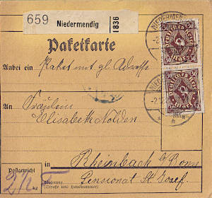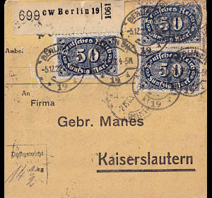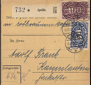 Inlandspaketkarte (6 500 g, > 75 km) vom 06.12.1922 frankiert mit 5 Marken (=168 Mark) |