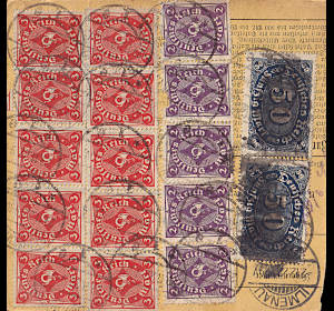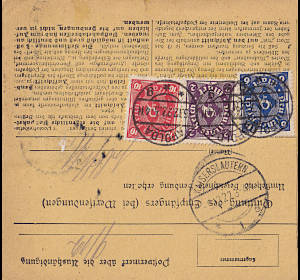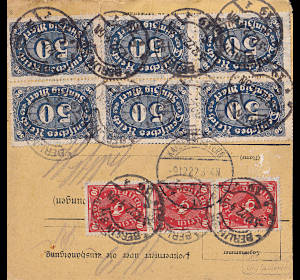 Inlandspaketkarte (9 700 g, > 75 km) vom 29.11.1922 frankiert mit 19 Marken (=240 Mark) |