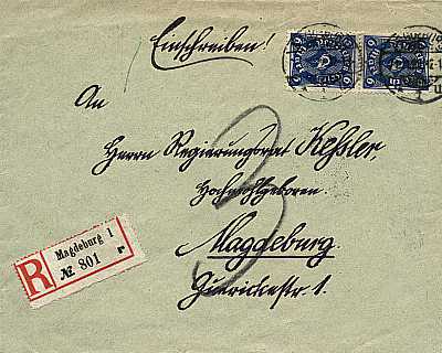 Ortsbrief mit Einschreiben (1-20 g) vom 21.11.1922 frankiert mit 2 Marken a 6 Mark (=12 Mark, 4 Brief 8 Einschreiben)