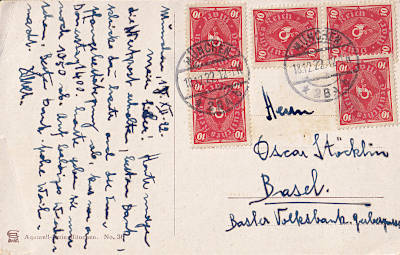 Auslandspostkarte vom 18.12.1922 frankiert mit 5 Marken a 10 Mark (=50 Mark)