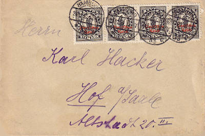 Inlandsbrief (1-20 g) vom 10.01.1923 frankiert mit 5 Marken a 5 Mark (=25 Mark)