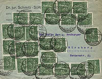 Inlandsbrief (1-20 g) vom 22.12.1922 frankiert mit 25 Marken a 1 Mark (=25 Mark)
