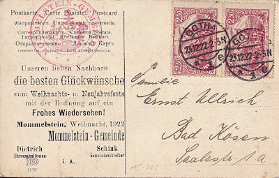 Inlandsdrucksache (1-25 g) vom 23.12.1922 frankiert mit 2 Marken a 2,50 Mark (=5 Mark)