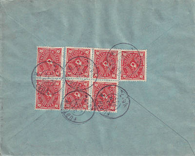 Auslandsbrief (1-20 g) vom 22.01.1923 frankiert mit 15 Marken a 10 Mark (=150 Mark)