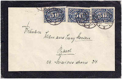 Auslandsbrief (1-20 g) vom 28.01.1923 frankiert mit 3 Marken a 50 Mark (=150 Mark)