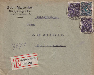 Inlandsbrief mit Einschreiben (1-20 g) vom 22.02.1923 frankiert mit 3 Marken (=90 Mark, 50 Brief 40 Einschreiben) |