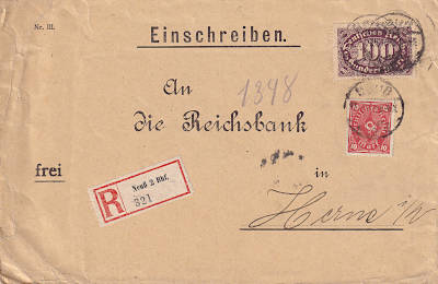 Inlandsbrief mit Einschreiben (1-20 g) vom 03.02.1923 frankiert mit 9 Marken a 10 Mark (=90 Mark, 50 Brief 40 Einschreiben) |