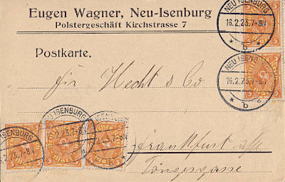 Inlandspostkarte vom 16.02.1923 frankiert mit 5 Marken a 5 Mark (=25 Mark)