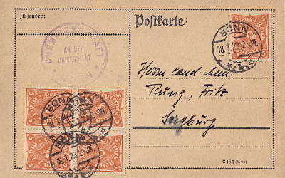 Inlandspostkarte vom 18.01.1923 frankiert mit 5 Marken a 5 Mark (=25 Mark)