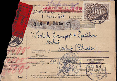 Auslandspaketkarte mit Eilzustellung (4 250 g) vom 18.05.1923 frankiert mit 10 Marken (=28 000 Mark)