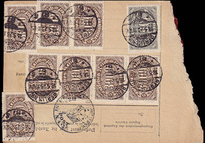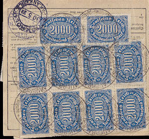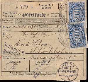 Auslandspaketkarte (5 000 g) vom 19.05.1923 frankiert mit 12 Marken a 2 000 Mark (=24 000 Mark)
